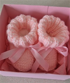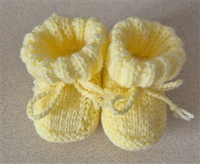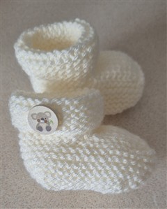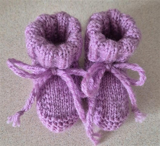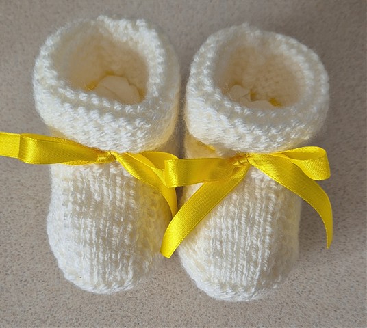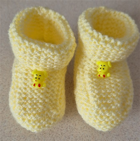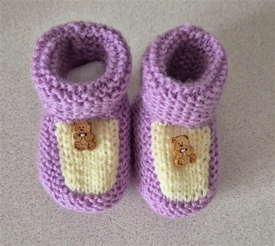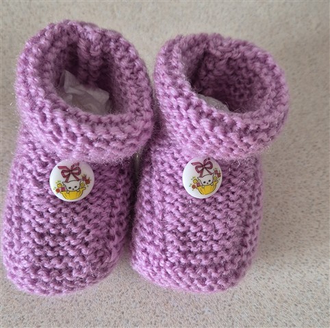 Ci-dessous, vous trouvez une série de petits chaussons de diverses couleurs. Chaque paire comporte soit un petit bouton décoratif, soit un ruban ou petit cordon.